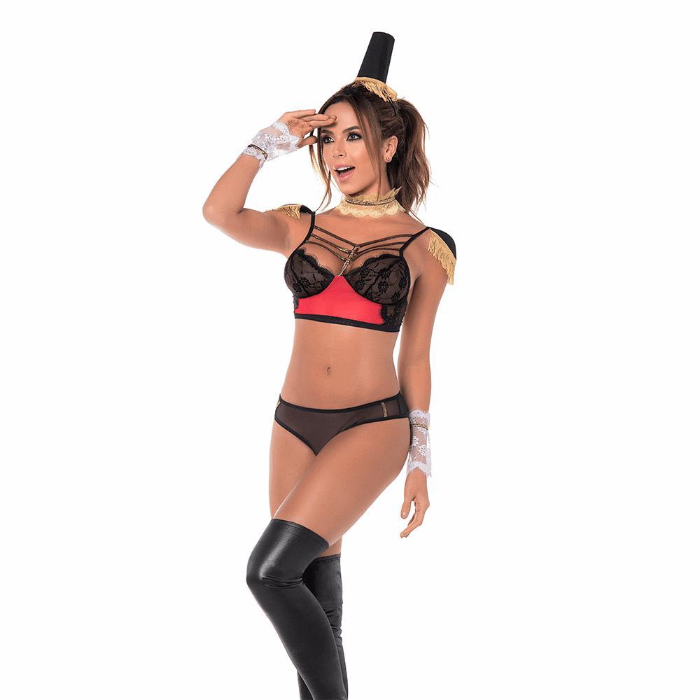 Su panty de color negro en malla con un sutil detalle dorado hará que se luzca el trasero de manera extraordinaria. De la misma manera, incluye un hermoso sostén en encaje rojo y negro, que además trae hombreras inspiradas en los más lujosos cascanueces de la época.