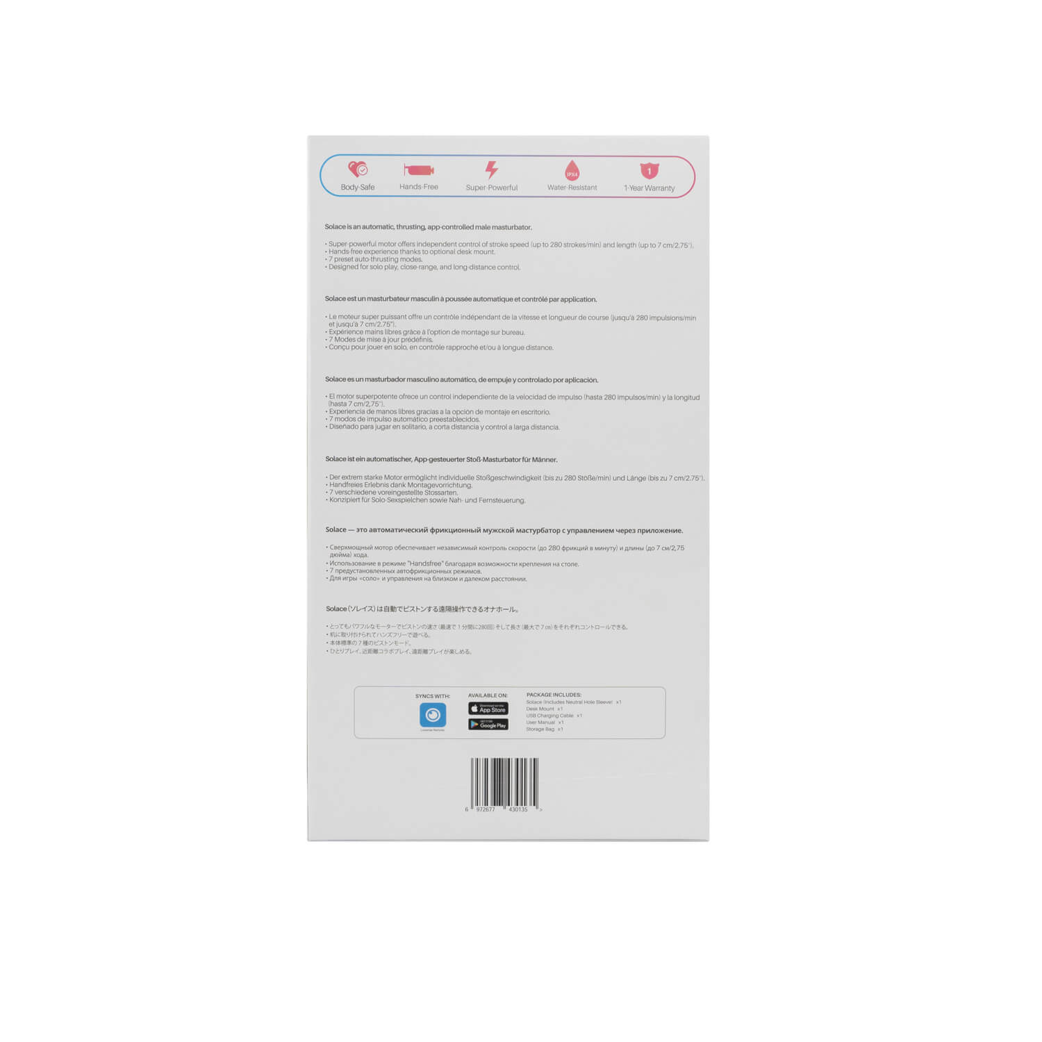 | Compatibilidad | Compatible con: • Diferentes plataformas Webcam (Lovense Extension) • App Lovense Remote disponible en iOS y Android • iPhone/iPad Air/iPad Mini/iPod Touch iOS 11.0 y superior • Android 5.0 y superior (con Bluetooth 4.0 activado) • Mac (con Bluetooth 4.0 activado) • PC Windows (necesita el Adaptador Bluetooth USB Lovense) |